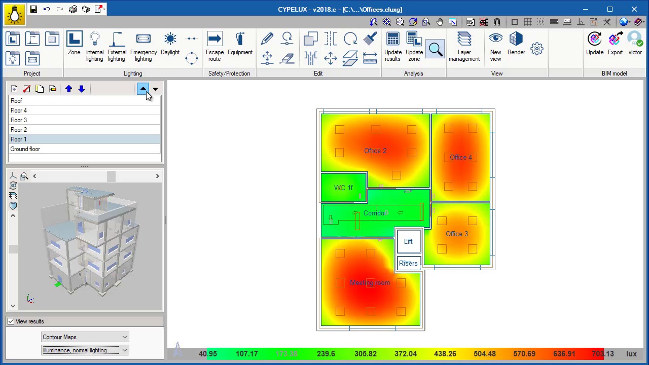 En bas à gauche : Étude des éclairages avec le logiciel CYPELUX.